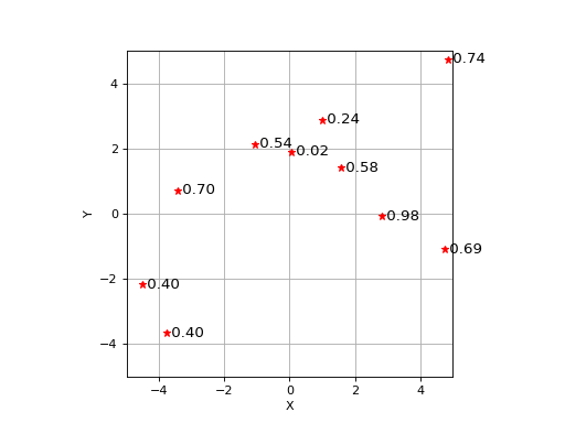 pand label them all with successive elements ofz>>> p = np.random.uniform(size=(2,10), low=-5, high=5) >>> value = np.random.uniform(size=(1,10)) >>> plotvol2(5) >>> plot_point(p, 'r*', ('{1:.2f}', value))