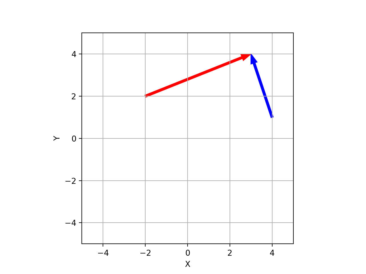 >>> from spatialmath.base import plotvol2, plot_arrow >>> plotvol2(5) >>> plot_arrow((-2, 2), (2, 4), color='r', width=0.1) # red arrow >>> plot_arrow((4, 1), (2, 4), color='b', width=0.1) # blue arrow
