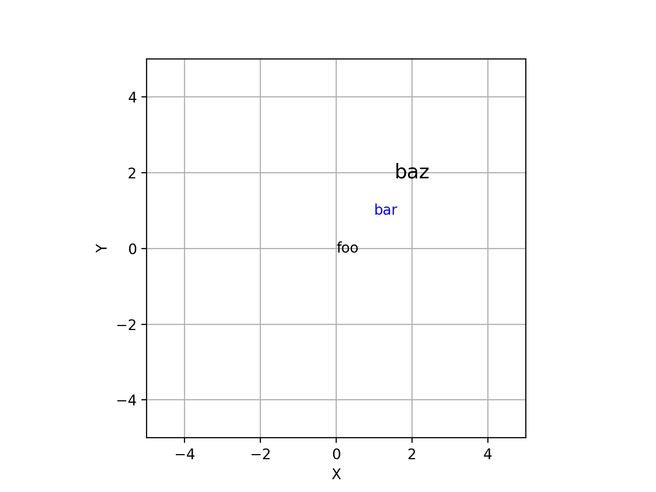 >>> from spatialmath.base import plotvol2, plot_text >>> plotvol2(5) >>> plot_text((1,3), 'foo') >>> plot_text((2,2), 'bar', color='b') >>> plot_text((2,2), 'baz', fontsize=14, horizontalalignment='centre')