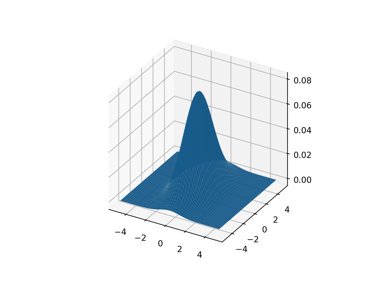 >>> a = np.linspace(-5, 5, 100) >>> X, Y = np.meshgrid(a, a) >>> P = np.diag([1, 2])**2; >>> g = gauss2d(X, Y, [0, 0], P)