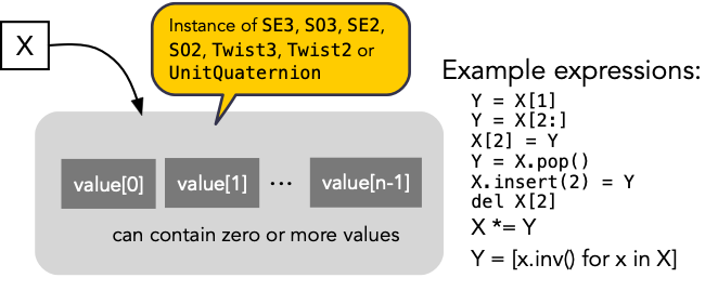 The Spatial Math package give these classes list super powers so that, for example, a single SE3 object can contain a sequence of SE(3) values: